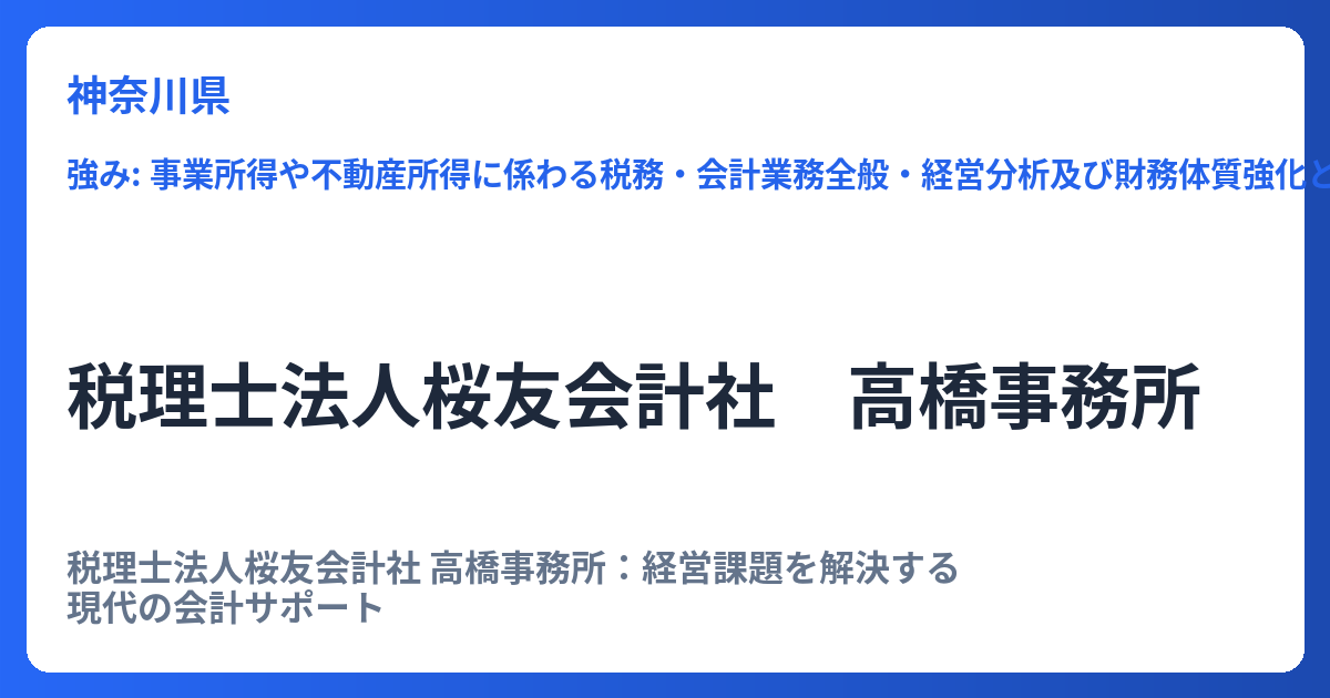 税理士法人桜友会計社 高橋事務所:経営課題を解決する現代の会計サポート 中小企業や個人事業主にとって、経理・会計業務は事業の根幹を支える重要な要素でありながら、その効率化やコスト管理は常に大きな課題となります。特に、デジタル技術の進化に伴... -