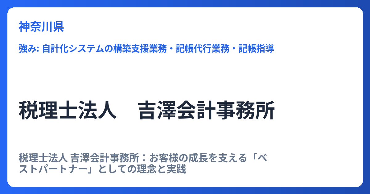 税理士法人 吉澤会計事務所:お客様の成長を支える「ベストパートナー」としての理念と実践 現代のビジネス環境は常に変化しており、企業経営においては、複雑化する税制や法規制への的確な対応、そして目標達成に向けた戦略的な財務・会計サポートが不可... -