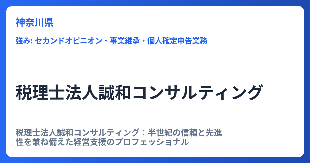 税理士法人誠和コンサルティング:半世紀の信頼と先進性を兼ね備えた経営支援のプロフェッショナル 「困ったら、誠和」というキャッチフレーズは、税理士法人誠和コンサルティングが長年にわたり、顧客にとって最も頼れるパートナーとして選ばれ続けてきた... -
