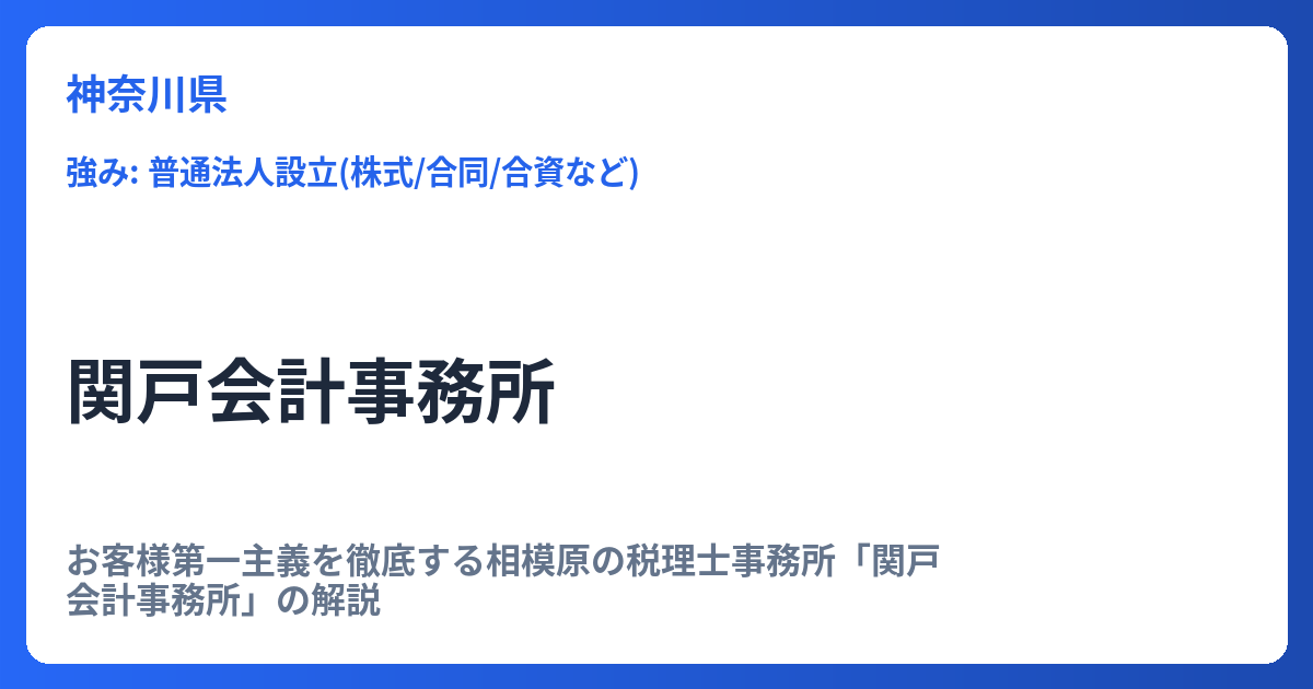 お客様第一主義を徹底する相模原の税理士事務所「関戸会計事務所」の解説 神奈川県相模原市に拠点を置く関戸会計事務所は、「お客様第一主義」を徹底したサービス提供を信条としている税理士事務所です。単なる税務会計の代行業務に留まらず、企業の成長を...