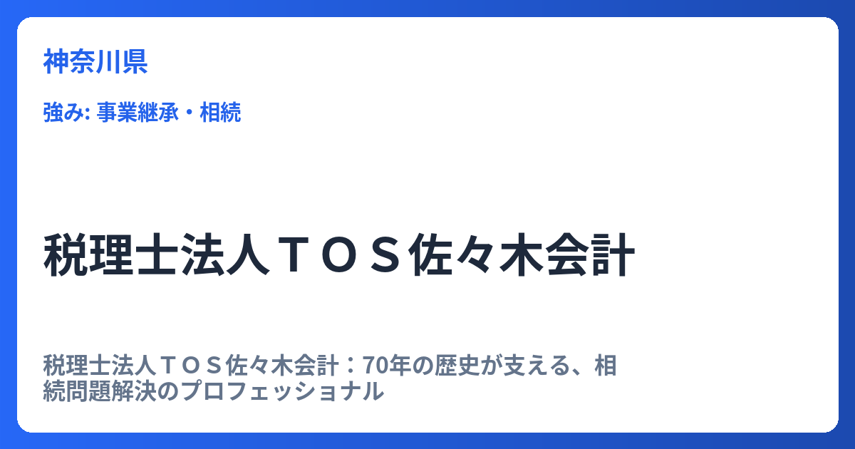 税理士法人TOS佐々木会計:70年の歴史が支える、相続問題解決のプロフェッショナル 税理士法人TOS佐々木会計は、長年にわたり地域社会の信頼を築いてきた「老舗事務所」としての確かな実績と、専門性の高いサービスを提供しています。特に、複雑でデリ... -