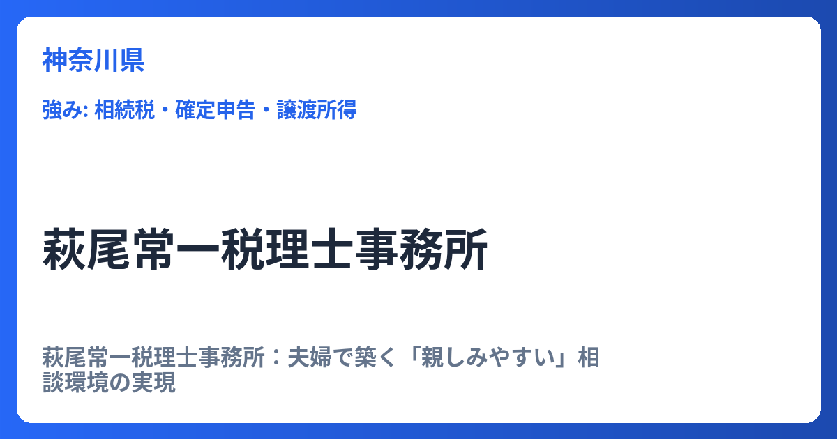 萩尾常一税理士事務所:夫婦で築く「親しみやすい」相談環境の実現 税理士事務所と聞くと、堅苦しい、相談しにくいといったイメージを持つ方も少なくありません。しかし、個々のクライアントが抱える悩みは多様であり、特に女性の事業主や個人の方にとって... -