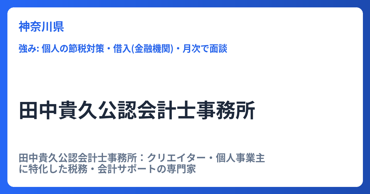 田中貴久公認会計士事務所:クリエイター・個人事業主に特化した税務・会計サポートの専門家 近年、インターネットの普及とデジタルコンテンツ市場の拡大に伴い、同人作家、商業作家、クリエイターといった個人事業主が経済活動において重要な役割を担うよ... -