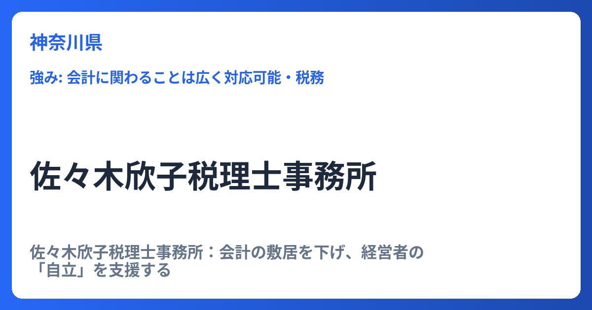 佐々木欣子税理士事務所:会計の敷居を下げ、経営者の「自立」を支援する 佐々木欣子税理士事務所は、単なる税務処理の代行に留まらず、顧問先企業が自ら会計データを把握し、経営判断に活かせる「自計化(自分で記帳・処理を行うこと)」を強力に推進して... -