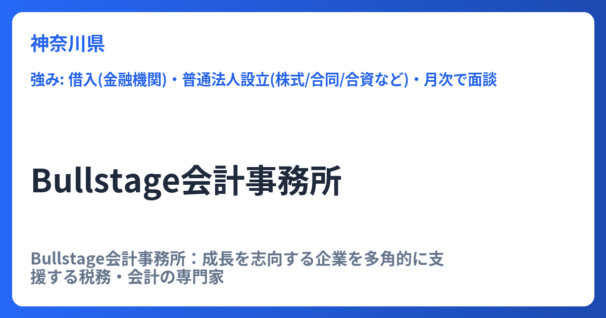 Bullstage会計事務所:成長を志向する企業を多角的に支援する税務・会計の専門家 Bullstage会計事務所は、中小零細企業から上場企業に至るまで、幅広い規模と業種のクライアントに対して税務・会計の専門的なサポートを提供している事務所です。単なる記帳... -
