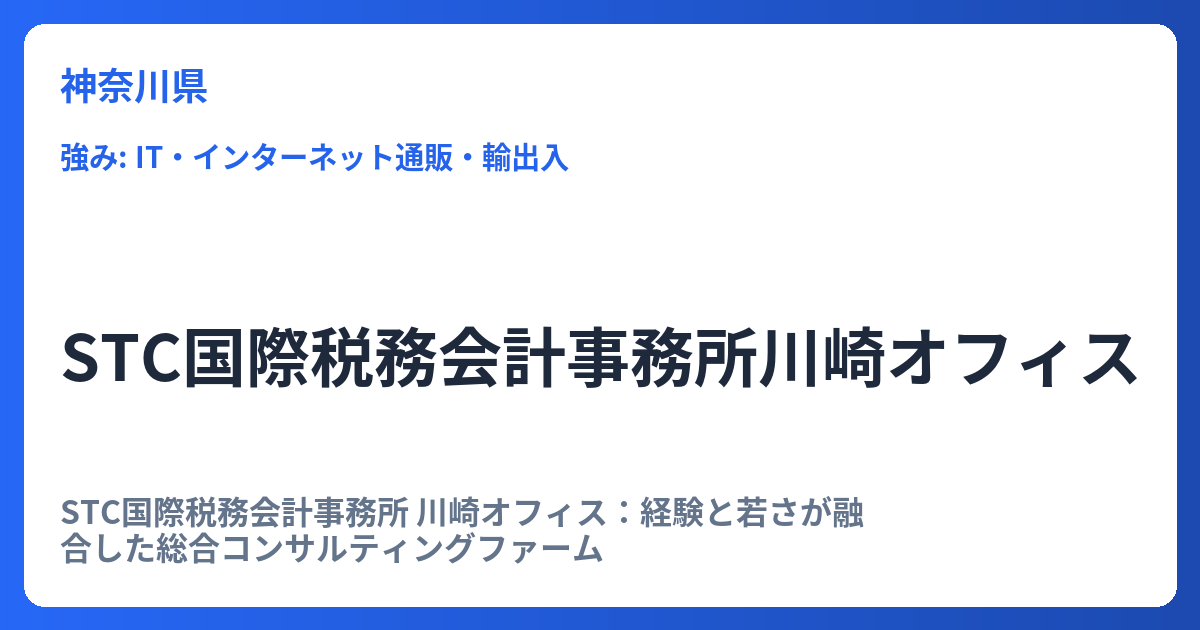 STC国際税務会計事務所 川崎オフィス:経験と若さが融合した総合コンサルティングファーム 税務会計の専門性と、経営を深くサポートするコンサルティング能力を兼ね備えた事務所をお探しでしょうか。「STC国際税務会計事務所 川崎オフィス」は、伝統的な税... -