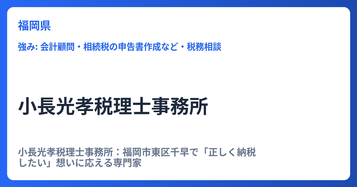 小長光孝税理士事務所:福岡市東区千早で「正しく納税したい」想いに応える専門家 事務所概要:地域に根差した税務のプロフェッショナル 福岡市東区千早に拠点を構える小長光孝税理士事務所は、地域の皆様の税務に関する課題解決をサポートする専門家集団...