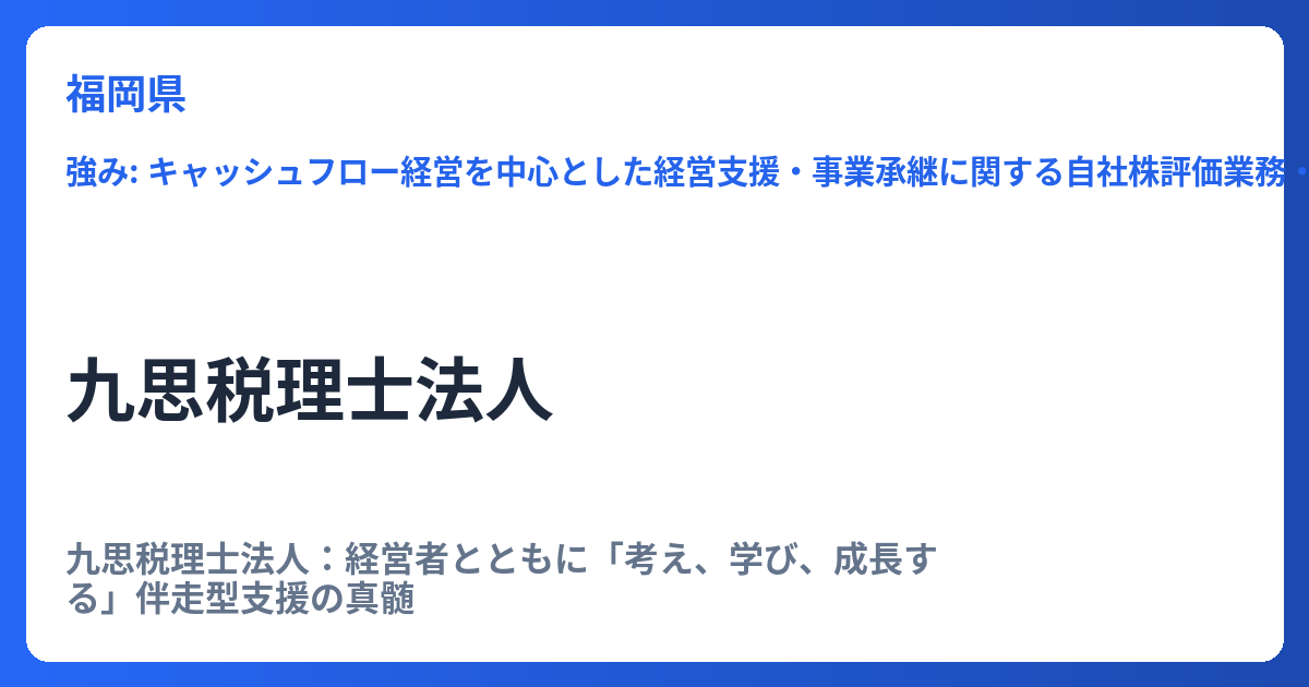 九思税理士法人:経営者とともに「考え、学び、成長する」伴走型支援の真髄 現代のビジネス環境において、企業が持続的に成長を遂げるためには、税務や財務に関する専門知識だけでなく、経営者の描くビジョンを深く理解し、実践的な課題解決をサポートする... -