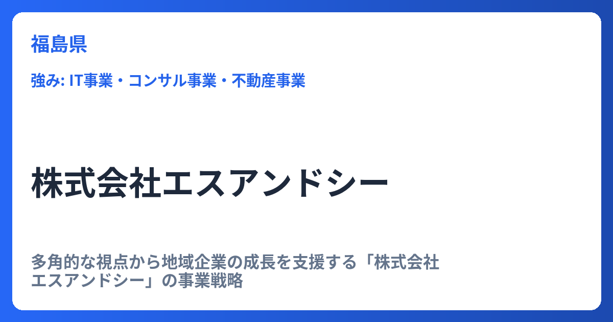 多角的な視点から地域企業の成長を支援する「株式会社エスアンドシー」の事業戦略 株式会社エスアンドシーは、地域の中小企業が直面する多岐にわたる経営課題に対し、単一的なサービスに留まらない総合的なソリューションを提供する企業です。経営コンサル... -