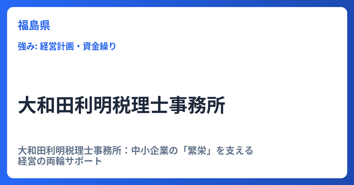 大和田利明税理士事務所:中小企業の「繁栄」を支える経営の両輪サポート 大和田利明税理士事務所は、「経営計画」と「資金繰り」という経営の二大要素を両輪として捉え、中小企業経営者の確かな繁栄を実現するための強力なサポートを提供しています。単な...