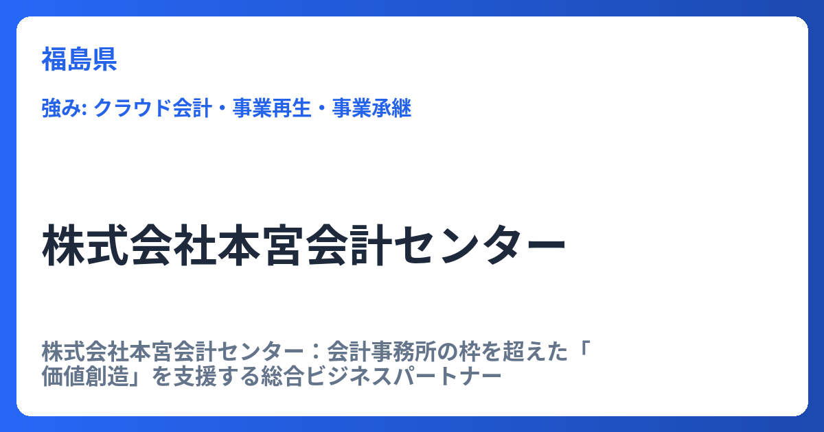 株式会社本宮会計センター:会計事務所の枠を超えた「価値創造」を支援する総合ビジネスパートナー 会計事務所の役割が単なる税務申告の代行に留まらない時代において、株式会社本宮会計センターは、顧問先の経営者が抱える本質的な課題解決と、企業価値の... -