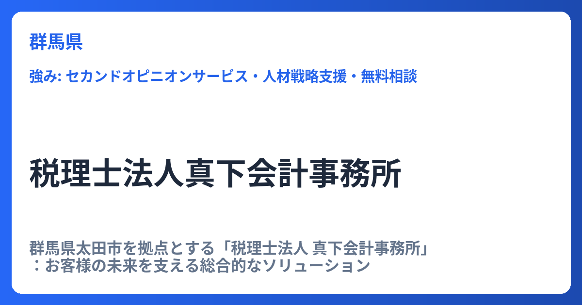 群馬県太田市を拠点とする「税理士法人 真下会計事務所」:お客様の未来を支える総合的なソリューション 税理士法人 真下会計事務所は、群馬県太田市に本店を構える専門性の高い会計事務所です。単なる税務申告や記帳代行といった従来の業務に留まらず、「... -