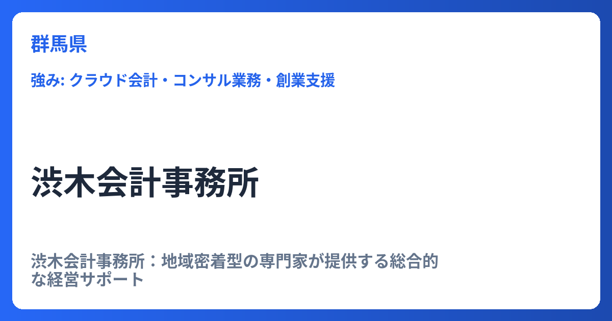 渋木会計事務所:地域密着型の専門家が提供する総合的な経営サポート 経営者にとって、税務・会計の課題は事業の成長と安定に直結する重要な要素です。複雑化する税制や、日々の経理業務に追われる中で、信頼できる専門家の存在は不可欠と言えるでしょう。... -