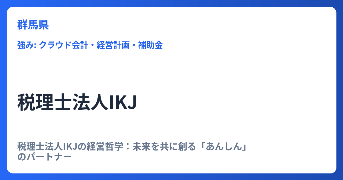 税理士法人IKJの経営哲学:未来を共に創る「あんしん」のパートナー 現代のビジネス環境は変化が激しく、中小企業の経営者にとって税務・会計の複雑な問題は、本業への集中を妨げる大きな要因となりがちです。そうした中で、税理士法人IKJは、単なる税務処... -