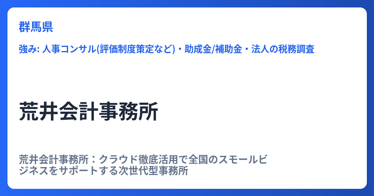 新井勇樹税理士公認会計士事務所:若さと経験が融合した次世代のパートナー 群馬県前橋市に拠点を置く新井勇樹税理士公認会計士事務所は、2021年11月の開業以来、地域の中小企業や事業主に対し、従来の枠にとらわれない新しい価値を提供しています。 特に... -