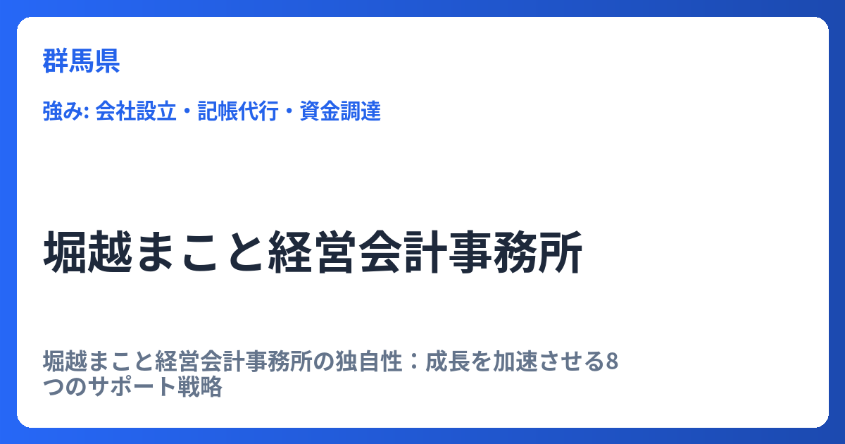 堀越まこと経営会計事務所の独自性:成長を加速させる8つのサポート戦略 堀越まこと経営会計事務所は、単なる税務会計の代行業者ではなく、事業のスタートアップから成長、そして継続的な経営改善までをトータルで支える「経営の強力なパートナー」です。... -