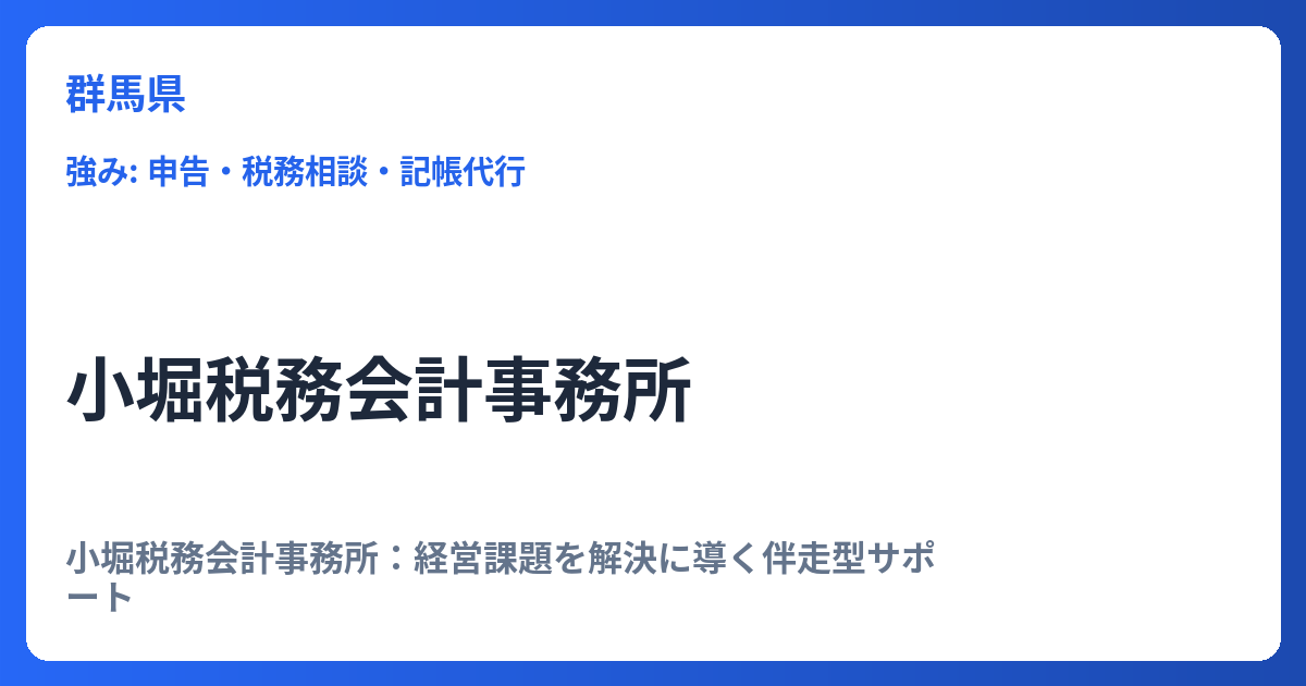 小堀税務会計事務所:経営課題を解決に導く伴走型サポート 現代のビジネス環境は、技術革新の加速や市場のグローバル化に伴い、経営者にとってかつてないほどの複雑さをもたらしています。特に中小企業や個人事業主の方々は、本業に加え、煩雑な税務・会計... -
