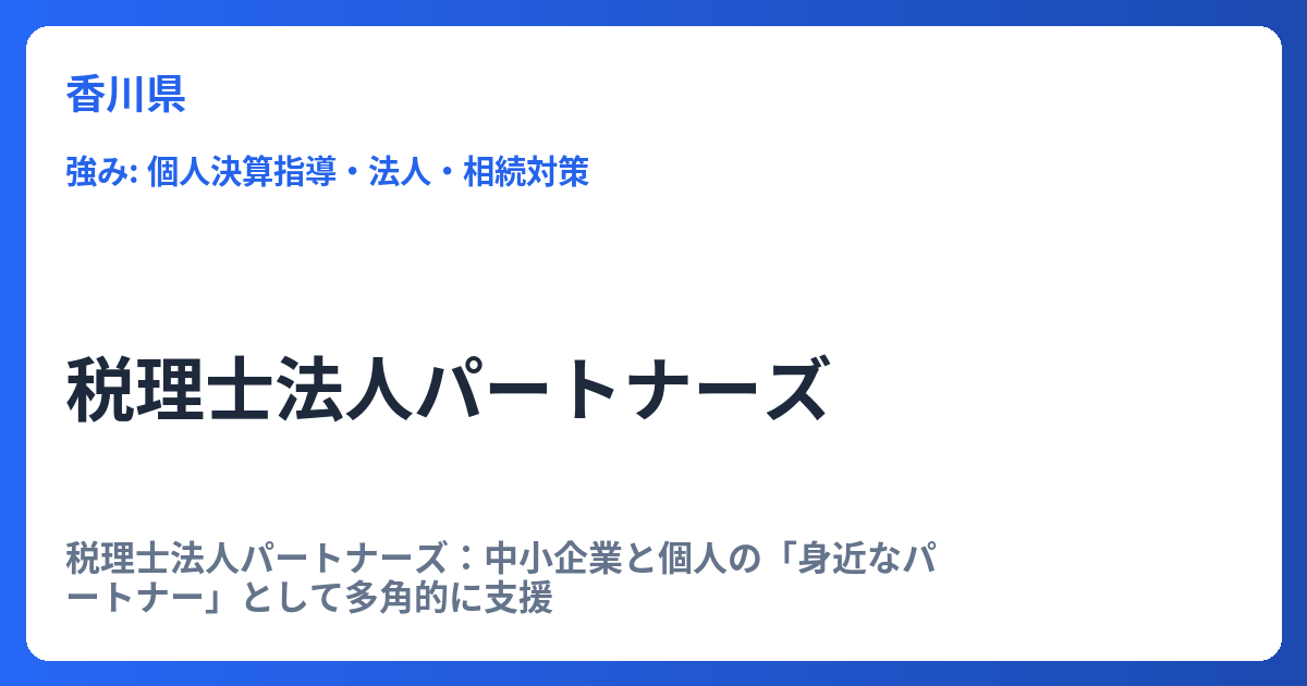 税理士法人パートナーズ:中小企業と個人の「身近なパートナー」として多角的に支援 税理士法人パートナーズは、単なる記帳代行や税務申告といった通常の税理士業務の枠を超え、クライアントの事業成長と円滑な資産承継を総合的にサポートする専門家集団で...
