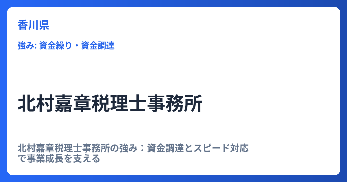 北村嘉章税理士事務所の強み:資金調達とスピード対応で事業成長を支える 事業を継続・拡大していく上で、税務・会計の専門家である税理士の存在は不可欠です。しかし、単に決算処理を代行するだけでなく、経営課題の解決や成長戦略の実行をサポートする「... -