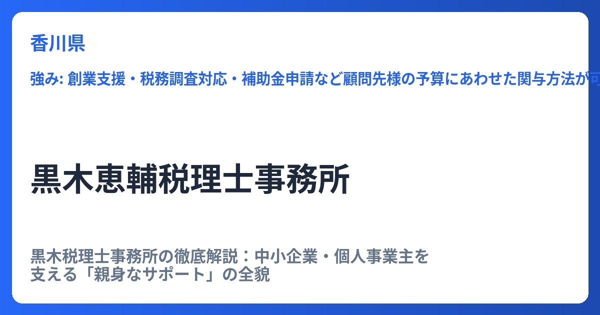 黒木税理士事務所の徹底解説:中小企業・個人事業主を支える「親身なサポート」の全貌 現代のビジネス環境において、税務・会計の専門家は、企業の持続的な成長と安定に不可欠なパートナーです。特に中小企業や個人事業主は、複雑化する税制や経営課題への... -
