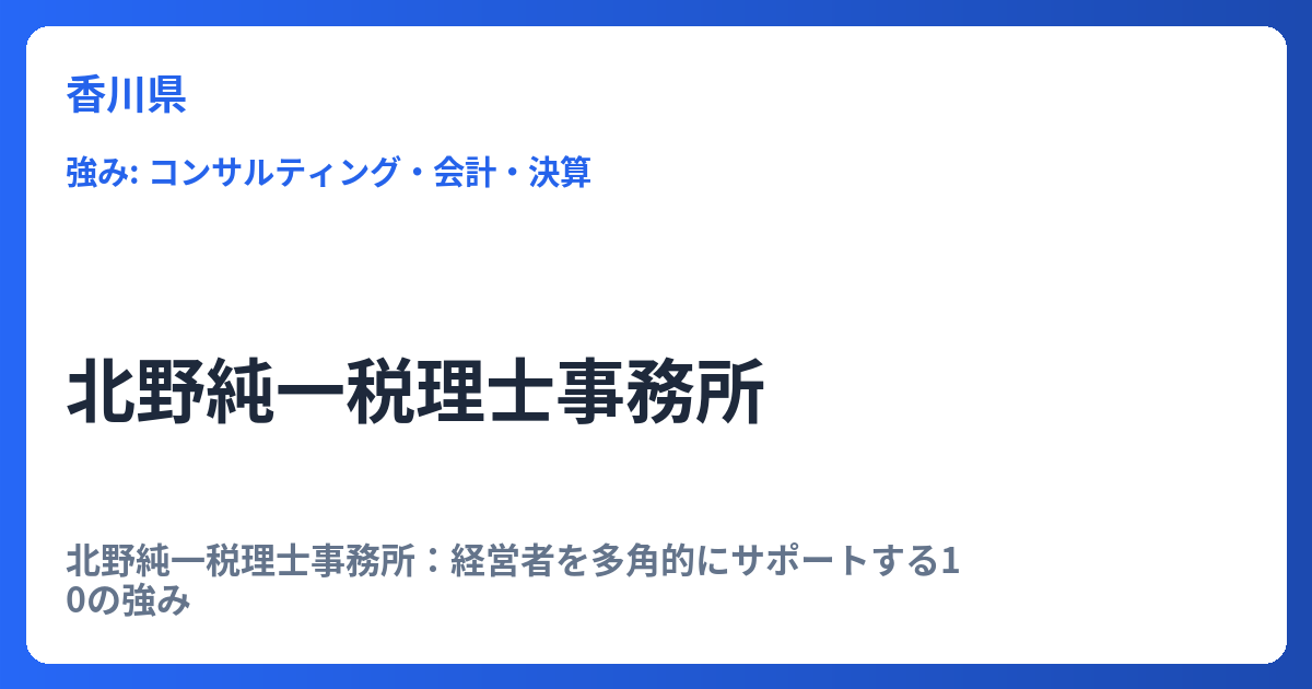 北野純一税理士事務所:経営者を多角的にサポートする10の強み 北野純一税理士事務所は、単なる税務申告の代行に留まらず、企業の成長と安定を強力に後押しする多岐にわたるサービスを提供しています。特に、経営者が直面する様々な課題に対し、専門的な知... -