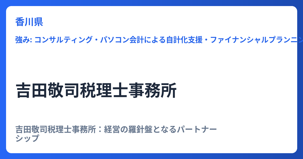 吉田敬司税理士事務所:経営の羅針盤となるパートナーシップ 現代の企業経営において、税務・会計は事業の健全性を保つための基盤であると同時に、成長戦略を策定するための重要な情報源です。香川県内外の多くの企業経営者から信頼を寄せられている吉田敬... -