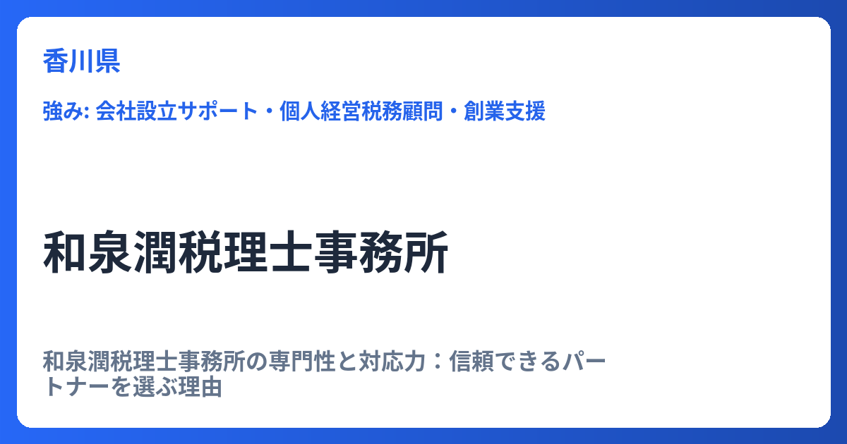 和泉潤税理士事務所の専門性と対応力:信頼できるパートナーを選ぶ理由 和泉潤税理士事務所は、複雑化する税務環境において、法人および個人事業主のお客様に対し、安心とスピード感のあるサービスを提供している専門家集団です。税法に関する深い知識と、... -