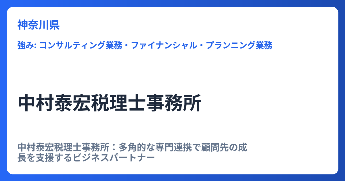 三國忍税理士事務所は、神奈川県川崎市幸区北加瀬に所在する税理士事務所です。地域に密着したサービス提供を重視しており、地元の中小企業や個人事業主、さらには個人の皆様の多様な税務ニーズに対応しています。